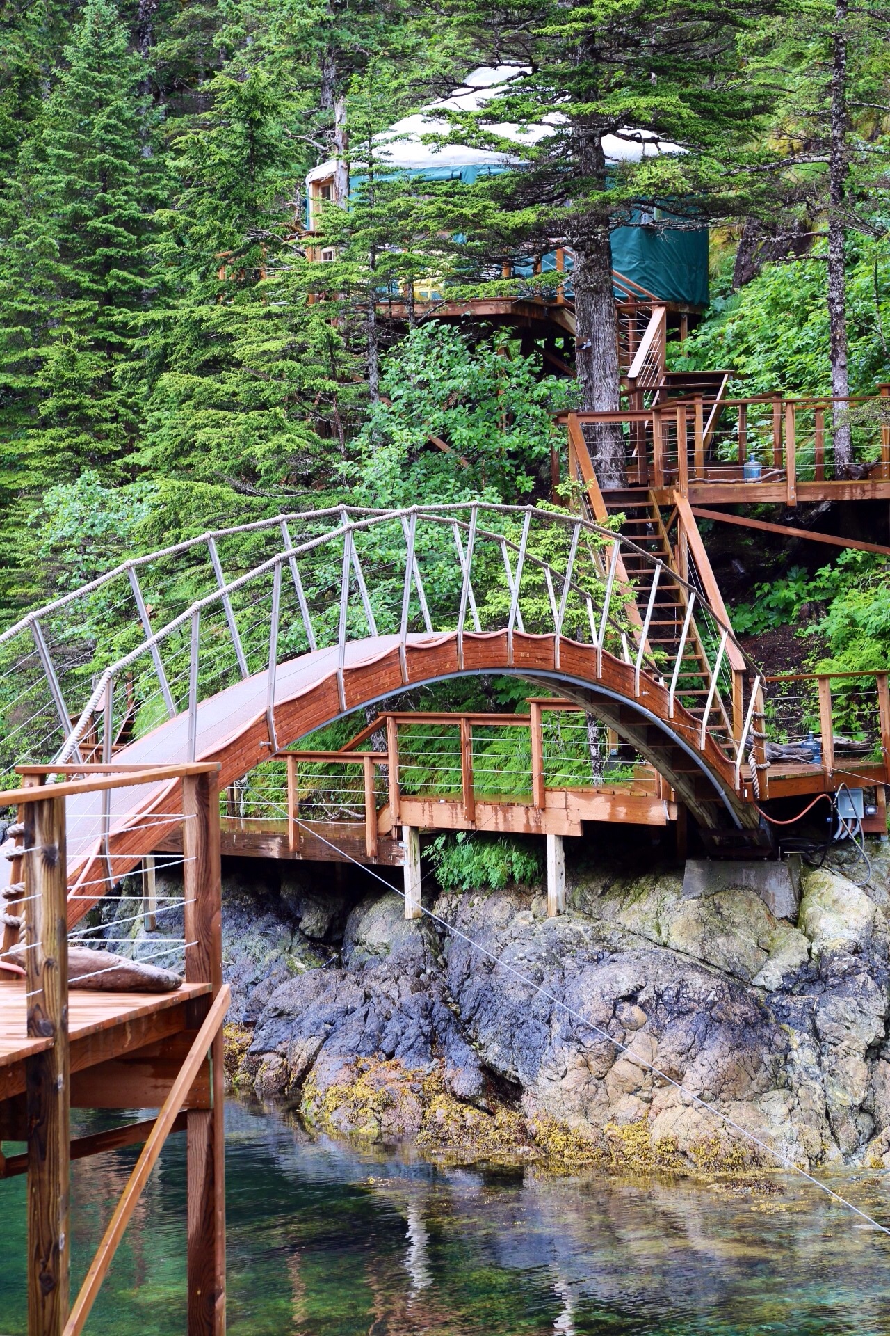 Though it has rained for much of the sightseeing trip, it abates as we arrive back in Seward. We have just under an hour to collect our things, pick up ice and find K wharf. All boxes are more swiftly ticked than we anticipate and we sit on the Seascape, a small tin vessel, waiting for Jonah ( from Orca Island cabins) to take us out. He arrives almost dead on time and we virtually retrace our path up Resurrection Bay towards Humpy Cove. Once in the cove, we can make out a collection of white roofed yurts dotting the shoreline and nestled in the trees. There is a little rocky outcrop with more yurts, wooden decks stretched out over the water and adorned with Adirondack chairs and a graceful, arched wooden bridge connecting the island to the mainland. The sun has come out and we are greeted by guests stoking a fire on the rocks under the bridge, welcome to heaven they say, and I suspect, they’re right.