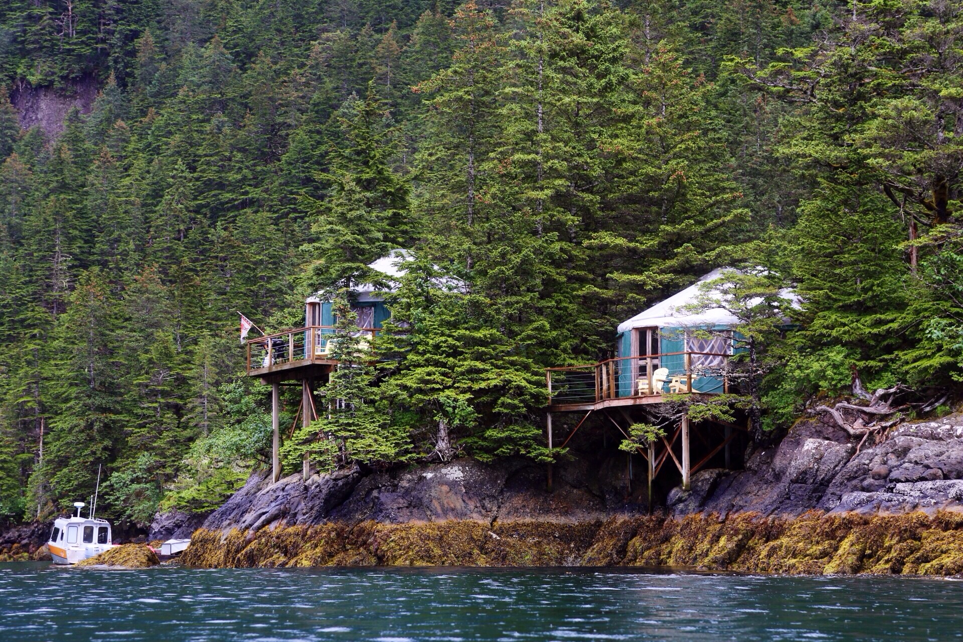 The rain briefly clears, so I make my way out of our yurt, along the boardwalks that straddle mossy forest – it’s really a bit like Swiss Family Robinson – to the yurt that houses Susan’s art gallery. Susan Swiderski owns and runs Orca Island Cabins, along with her husband Dennis, son Jonah and daughter in law, Yen. They are all incredibly friendly and welcoming and helped us settle in very quickly. Susan is an artist, she uses the island as her studio, painting beautiful landscapes mostly on canvas. The gallery also sells cards, prints, scarves painted by Susan, handmade jewellery and other lovely things. I spend a peaceful half hour here, soaking in the view and adding things to a mental shopping list.