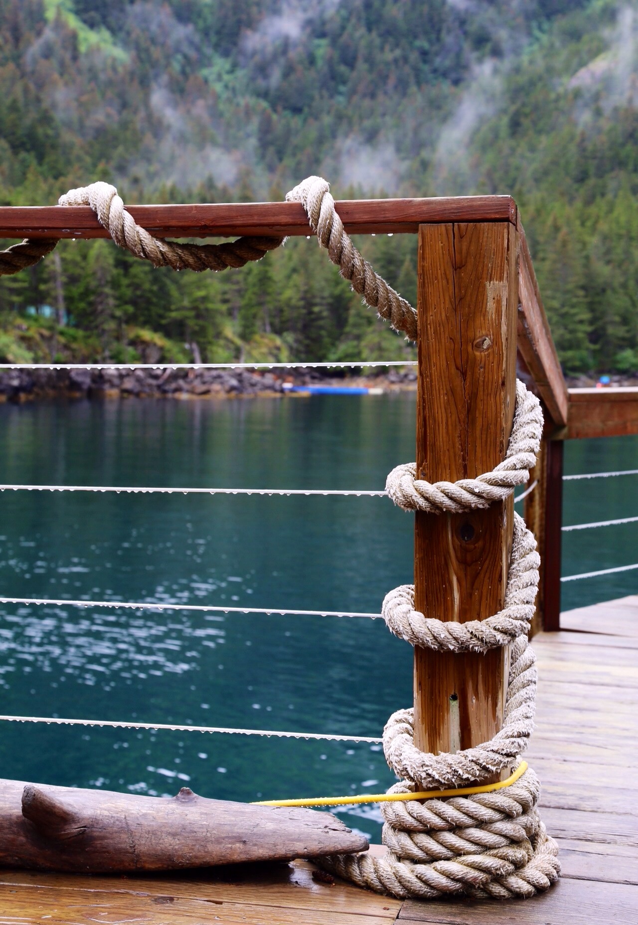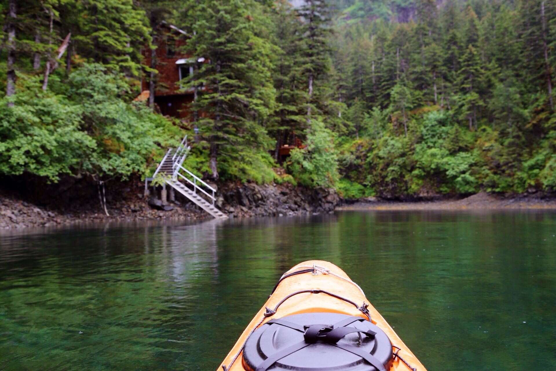 Leaving the gallery, I pick my way carefully down to the rocky shore and snap some pictures of the clear water, the bridge and yurts and spruces on the opposite shore. The rain is holding off so I decide to collect Gordon and go for a paddle. Dressed for rain, we select a double kayak and jump in. We glide out of the cove towards a nearby inlet that, we’re told, has a waterfall. It’s very still and calm, the water glassy; I can take photos of the reflections. There are some private cabins scattered around and we also pass a group of divers. We can hear the waterfall and see the lower creek but decide not to get out to explore further. Big, fat drops of rain are starting to fall so we head out. At the edge of the inlet, we meet another group of kayakers, some smiling, some a little chagrined. The rain is getting harder. Their guide is a stereotypical, all American girl, extremely enthusiastic to be out on the water. We shout greetings and continue, not towards our cabin but out into Resurrection Bay, towards Fox island. Gordon thinks we are not far from the bird rookery, and puffins, that we had seen yesterday. We paddle from point to point until, with rain increasing even further and no sign of the cliffs, we reluctantly turn back to Humpy Cove.