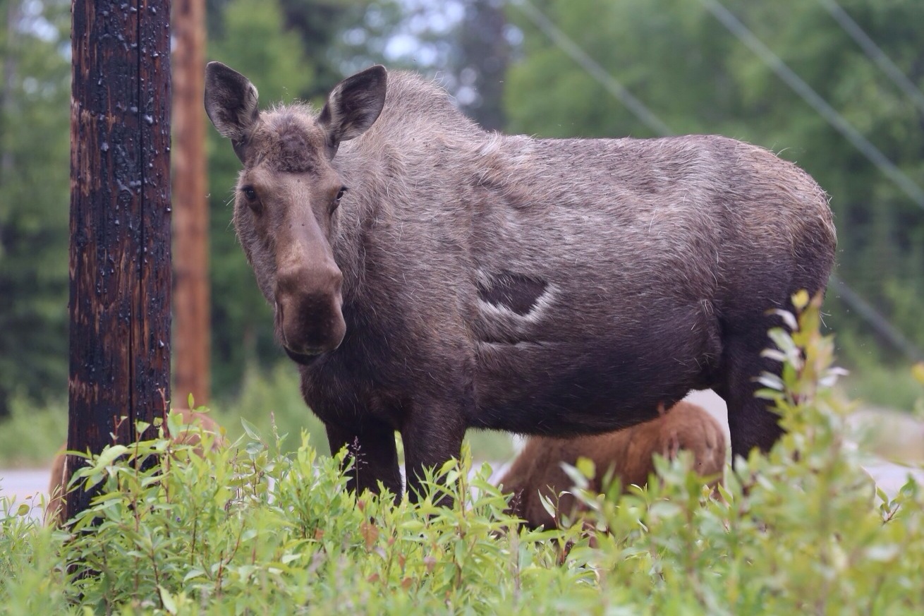 About half way to Homer, we pass signs warning of moose crossings, 144 moose have been hit already this year in this area. I haven’t actually seen a moose yet and am starting to doubt their existence, when, off to my right, I spy a very large horse with two other smaller creatures. I think that might be a moose I tell Gordon. He is doubtful but obligingly turns the car around. Yep, it’s a moose…we get onto a small, gravel road that leads us nearer. Oh, great luck…those creatures are baby moose. Pretty, fawn coloured calves about the size of a large dog. Mum is protective, I take pictures of her but she shields her babies, putting herself between us and them. We watch for a while, then resume our journey south.