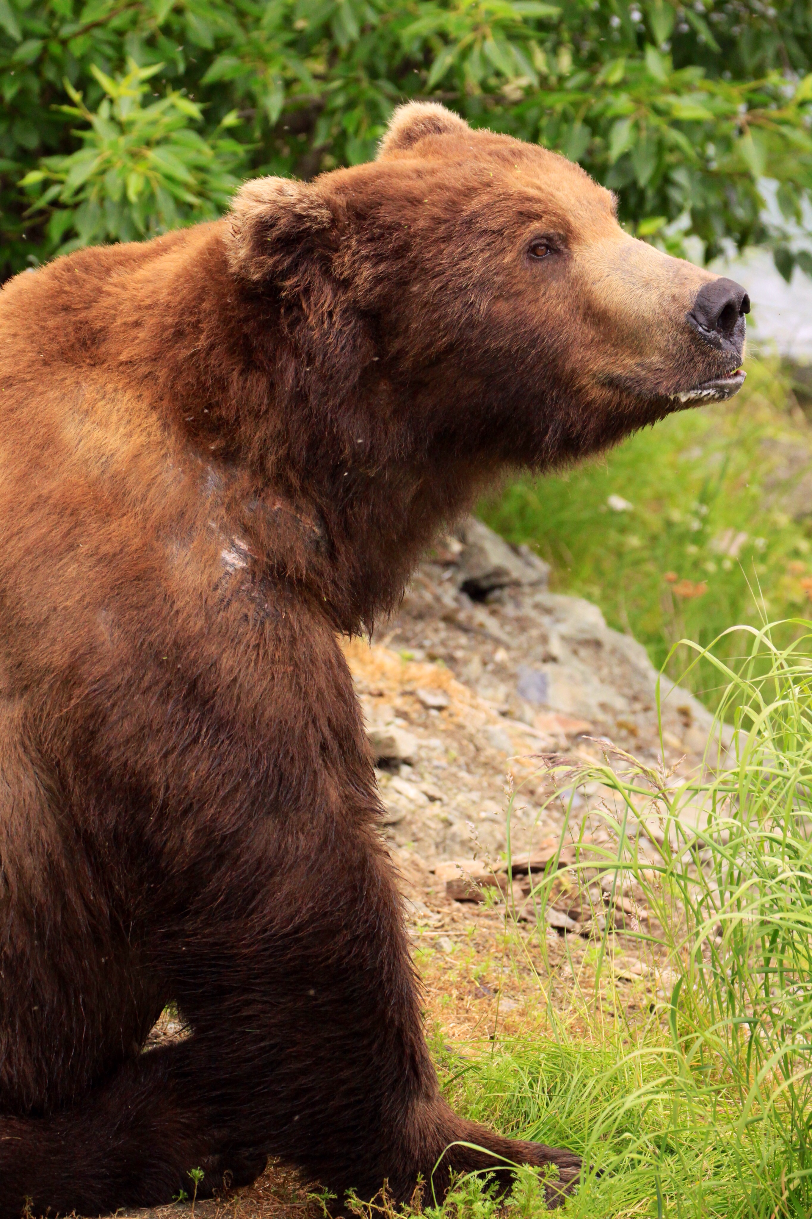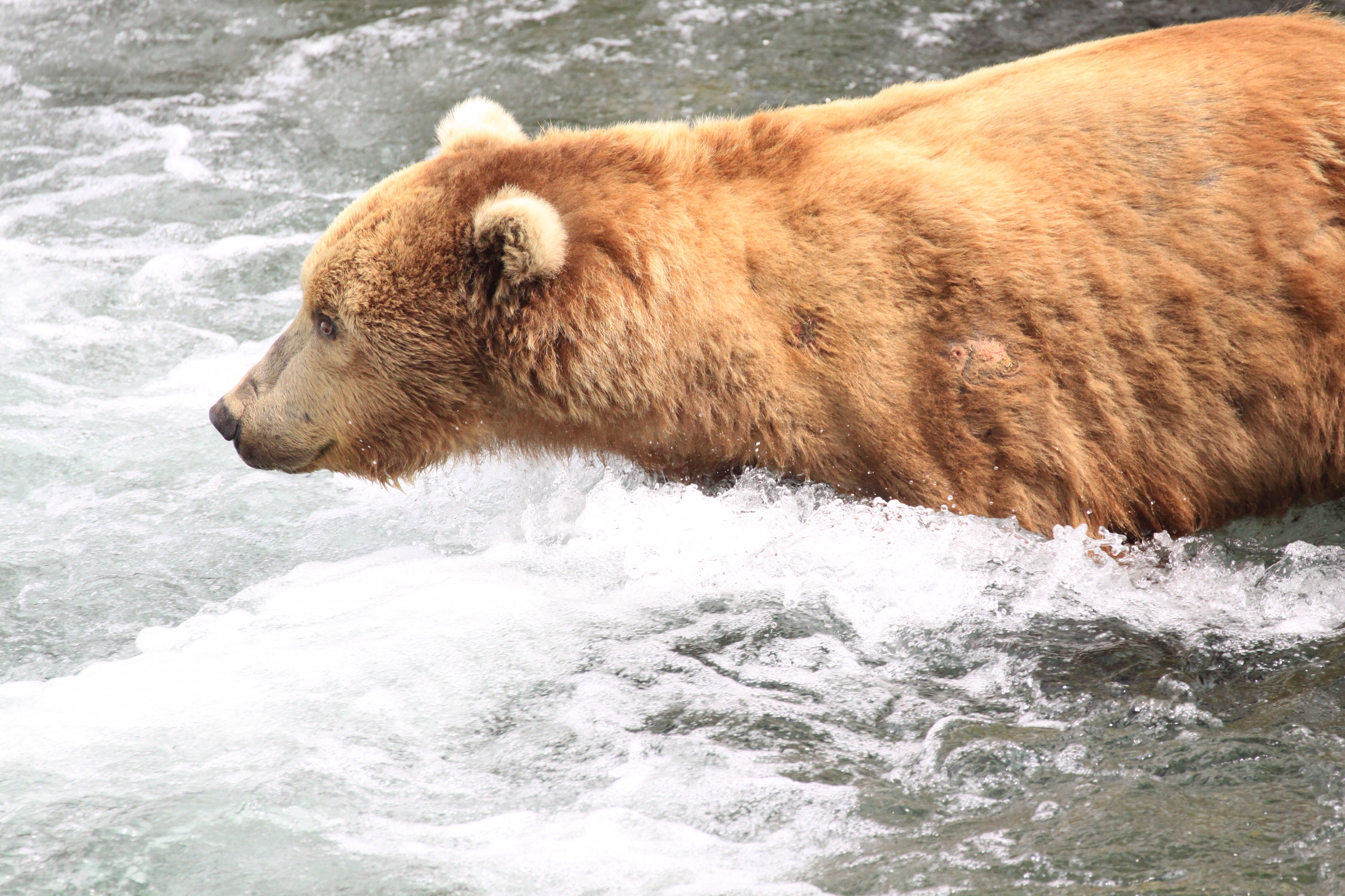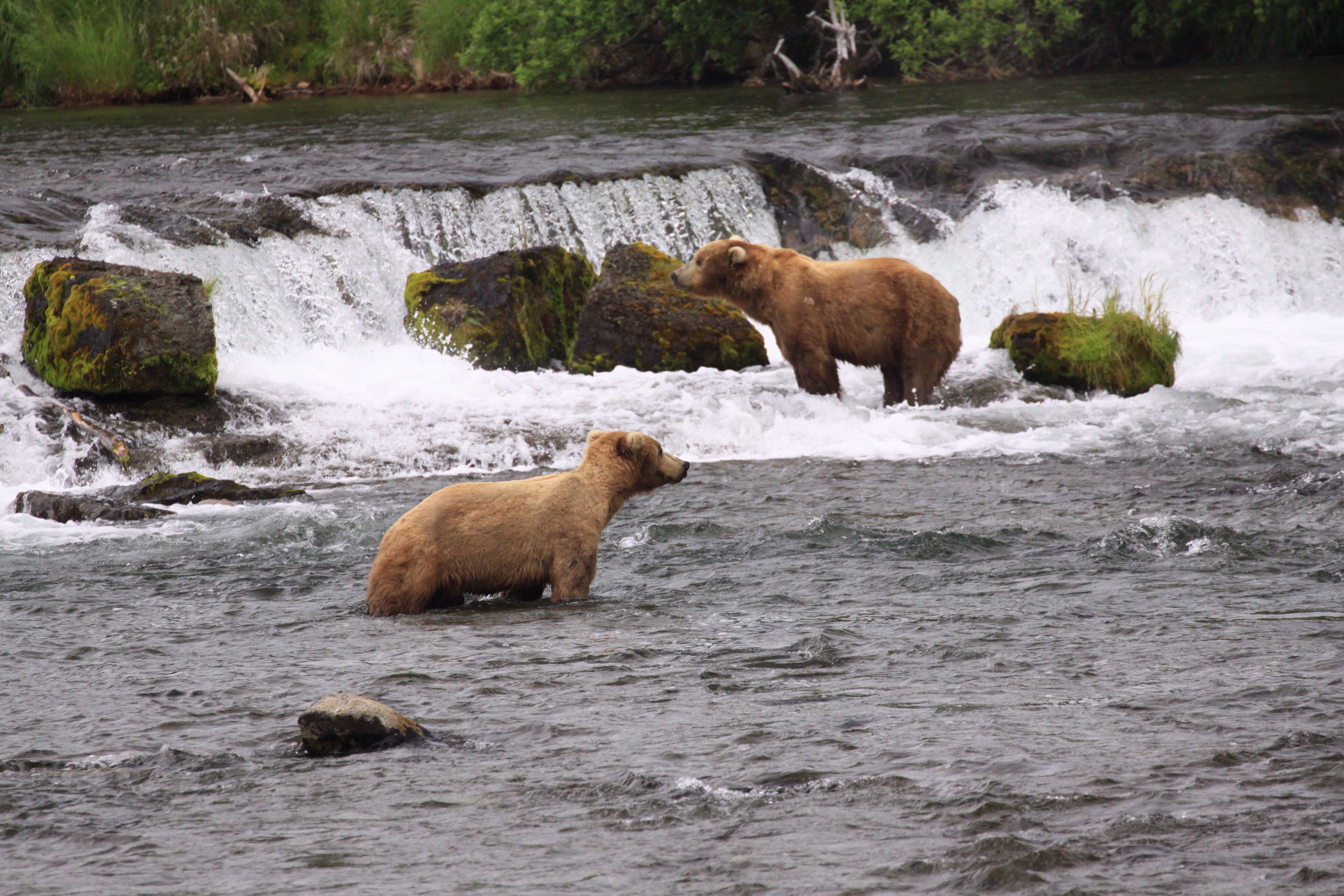 The main viewing platforms are right on the Brooks Falls. The upper one is time managed – you put your name down, and if there’s room, you move out and get an hour of premium space. When time is up, you go back to the rangers and visit the lower platform. There is no problem putting your name down for another visit and the rangers will call when it’s your turn. Visitors are varied but all have cameras, from the Japanese girls (whom seem more interested in taking selfies, than the bears themselves) to the freelance German photographer, who has a boatload of equipment…huge zoom, big tripod. Most people are considerate and friendly, moving around for everyone to have a turn at the best viewing spots. Bear traffic is slow at first, one comes, splashes around, looks for fish and, when unsuccessful, moves off. Another wades up the river, snout down, eyes keen. They look hungry. The salmon haven’t started running consistently yet and we don’t actually get to see any jumping or being caught. The odd bird snatches a fish from the fast flowing water and a group of ducklings make their way comically, as they get tumbled by the current, across to the other bank but basically, we wait patiently for bears. Near the middle of our time, and when we are on the lower platform (no time limit here) there are three bears in the falls and another two appear on the banks, one chasing the other. I don’t care if I am allowed down there…these platforms are where I’ll stay!
