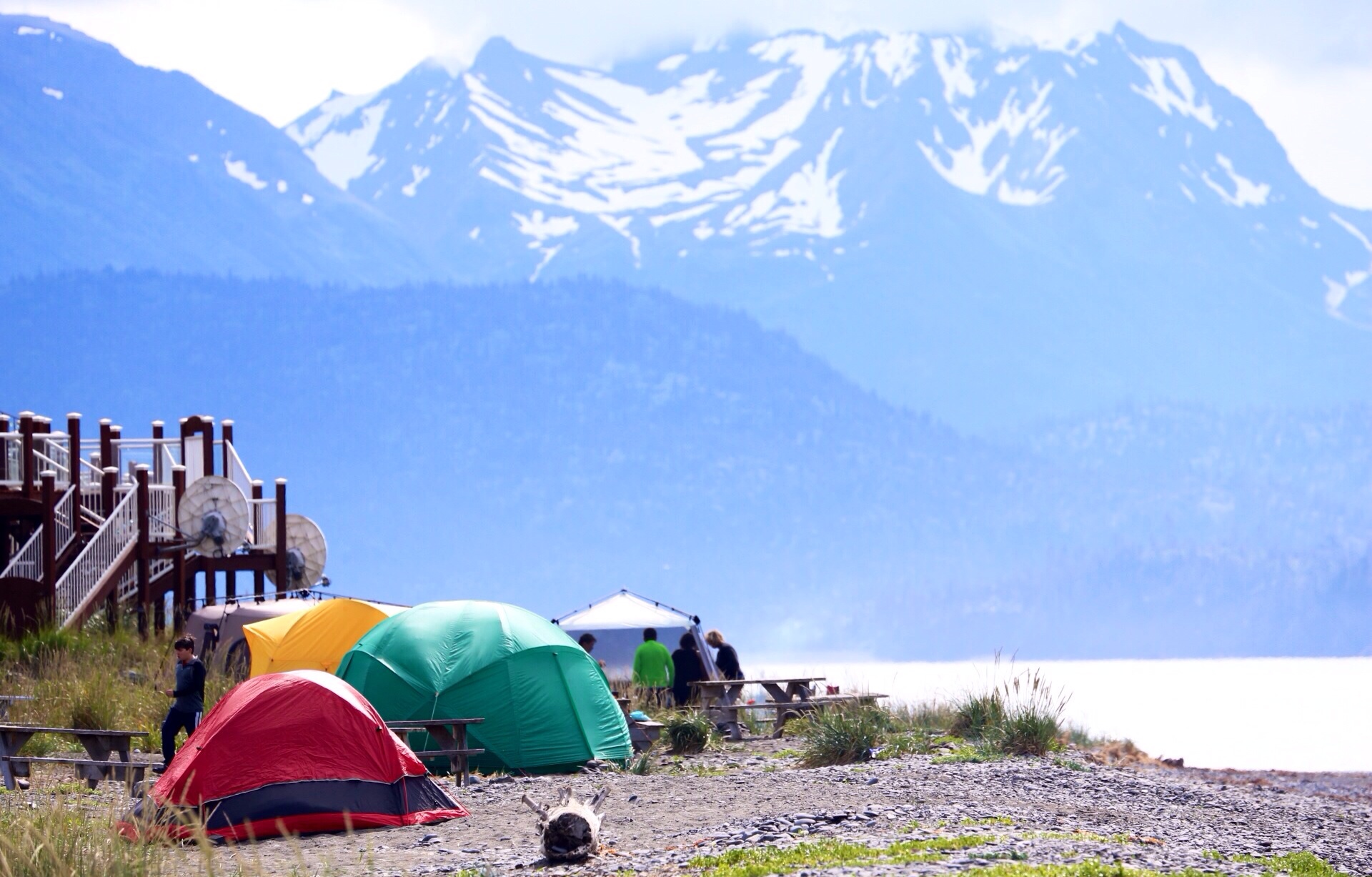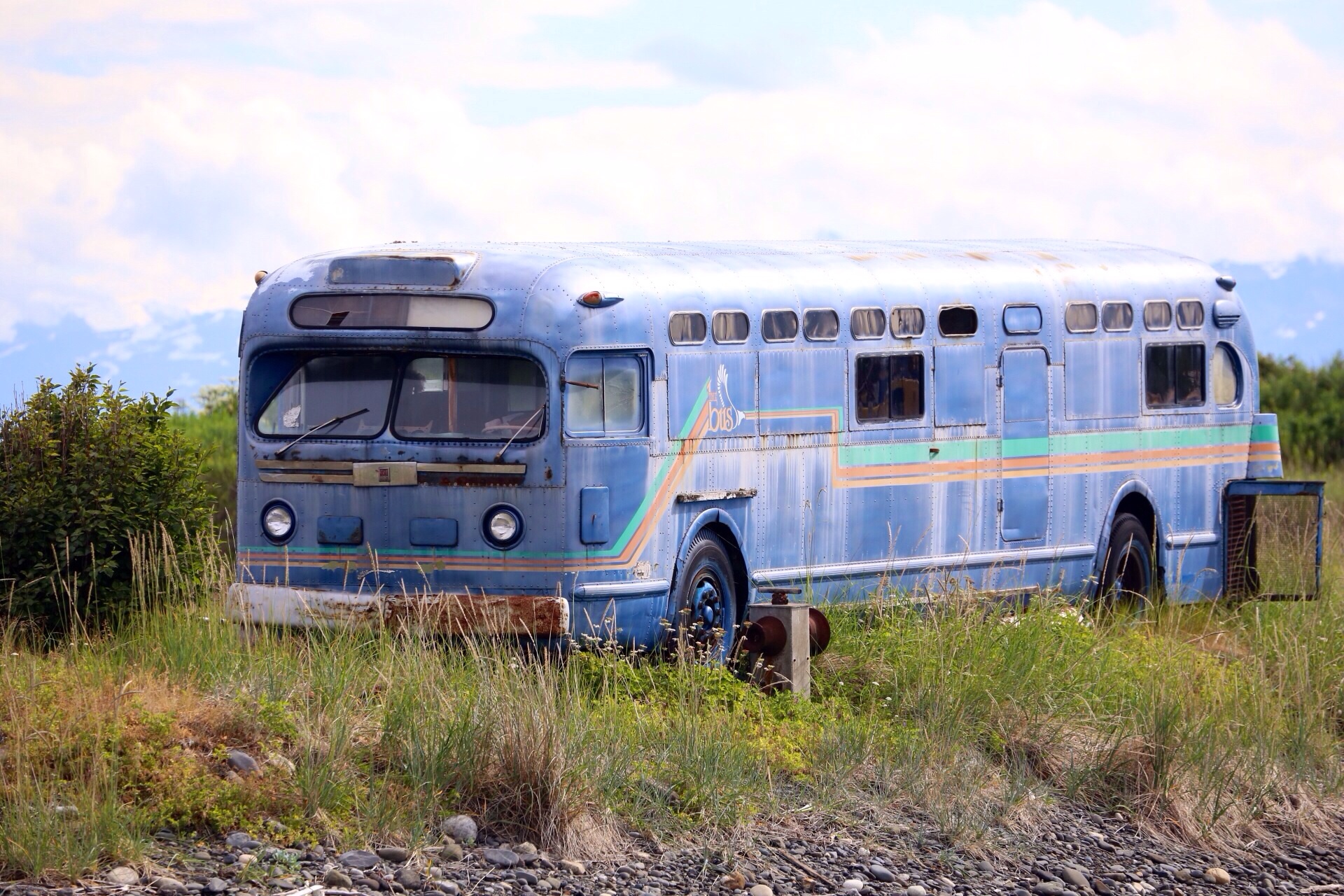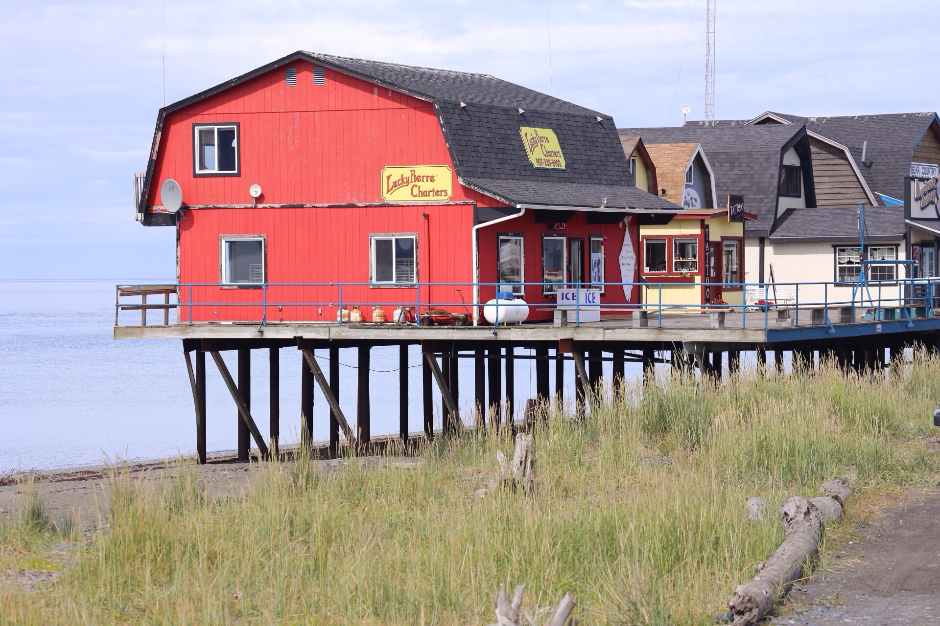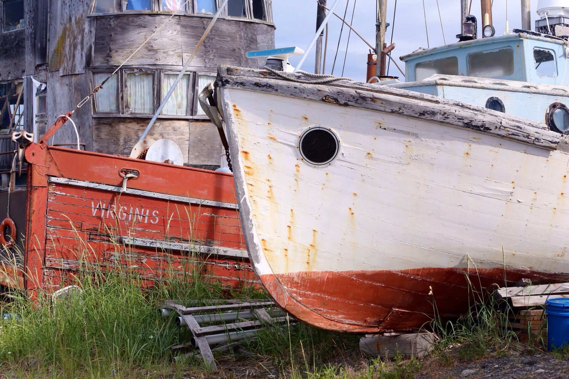 Clear skies greet us as we drive out to the Homer Spit for a closer look around and some brunch. First stop, the boat graveyard.,it’s on private land but you can park and have a wander. There are old fishing boats, caravans, buses and other assorted nautical things lined up along the road. I think someone is living in the bigger boat – a kiwi flag acts as a curtain and it looks inhabited. I get some great photos here. Onwards to the la Baleine Cafe for a very goof brekkie…I have the breakfast sandwich, it’s served with strawberries and Gordon has the breakfast skillet – corned beef hash, peppers, potatoes…and very good coffee. It’s warm in the sun so we sit awhile and soak up the atmosphere of this unusual place. As I said in an earlier post, the Spit is where the tourist action happens in Homer. People are camped on the beaches, RVs are everywhere and pickups rule.