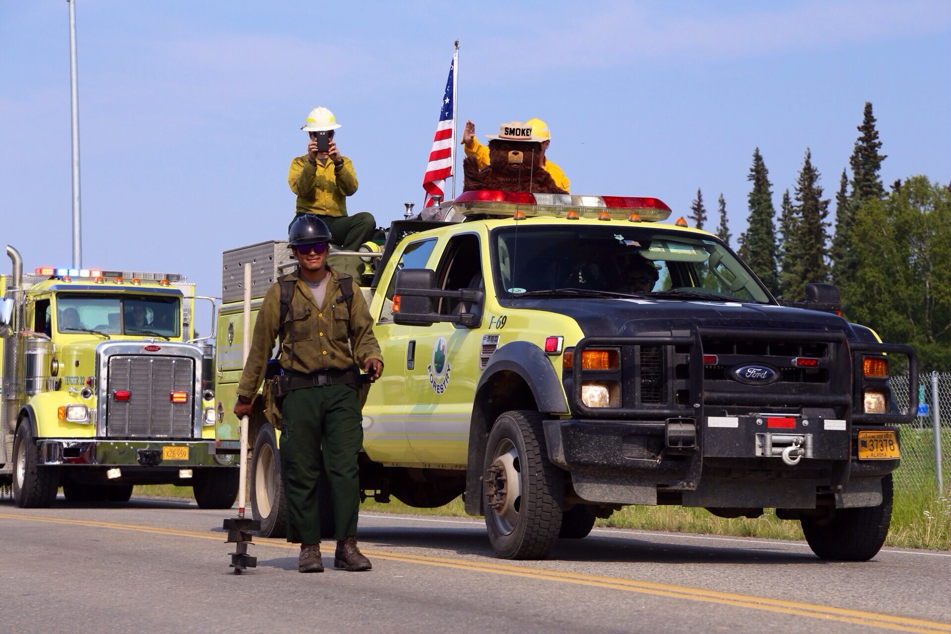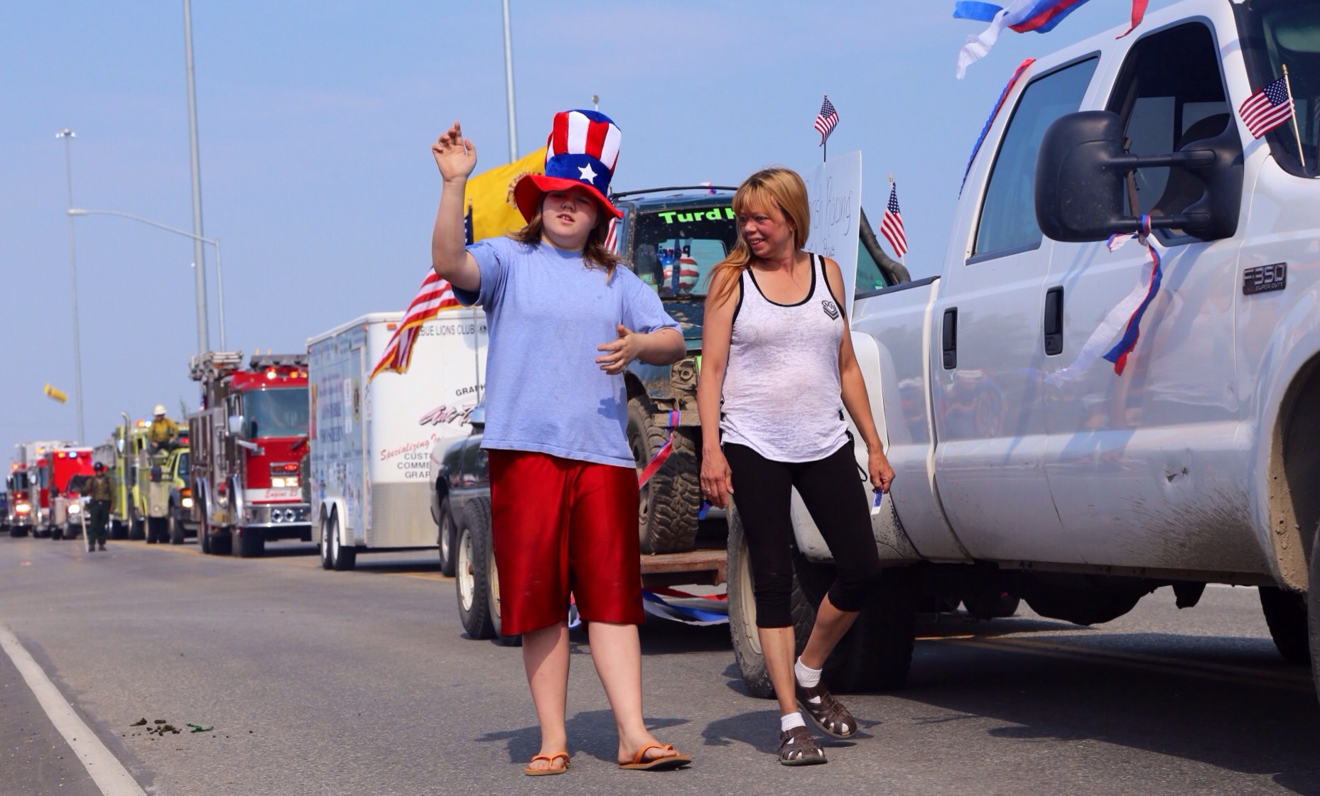 To explore Fairbanks we realise we will need transport, so a quick cab ride to the airport for GG and he is back with a rental car. First stop, North Pole…no, it’s not THE North Pole but the magnetic pole was once located here, now, it’s just a small township on the outskirts of Fairbanks, along the highway to Canada. The light poles, signposts and even the Maccas post under the M are all candy striped. You get off the motorway onto Santa Claus Lane and turn into St Nicolas Drive to get to the Santa Claus House, it’s open all year and yes, stuffed with all things Christmassy. It’s cheesy but fun, we wander around, buy a decoration, some tshirts and some very good peanut butter fudge. Outside, the Independence Day parade has started. We grab coffees and join the locals sitting in the gutter to watch it pass. It’s a small town affair with all the local rural agencies represented; townsfolk walk with their dogs, who of course are dressed in red, white and blue. There are parade princesses and the local politician handing out copies of the Declaration of Independence. It’s great fun and then, the fire brigade troop past, gleaming trucks and equipment and then, to put the cherry on top, Smokey the Bear! Yay, I grew up watching him on tv. We cheer with the rest of the crowd.