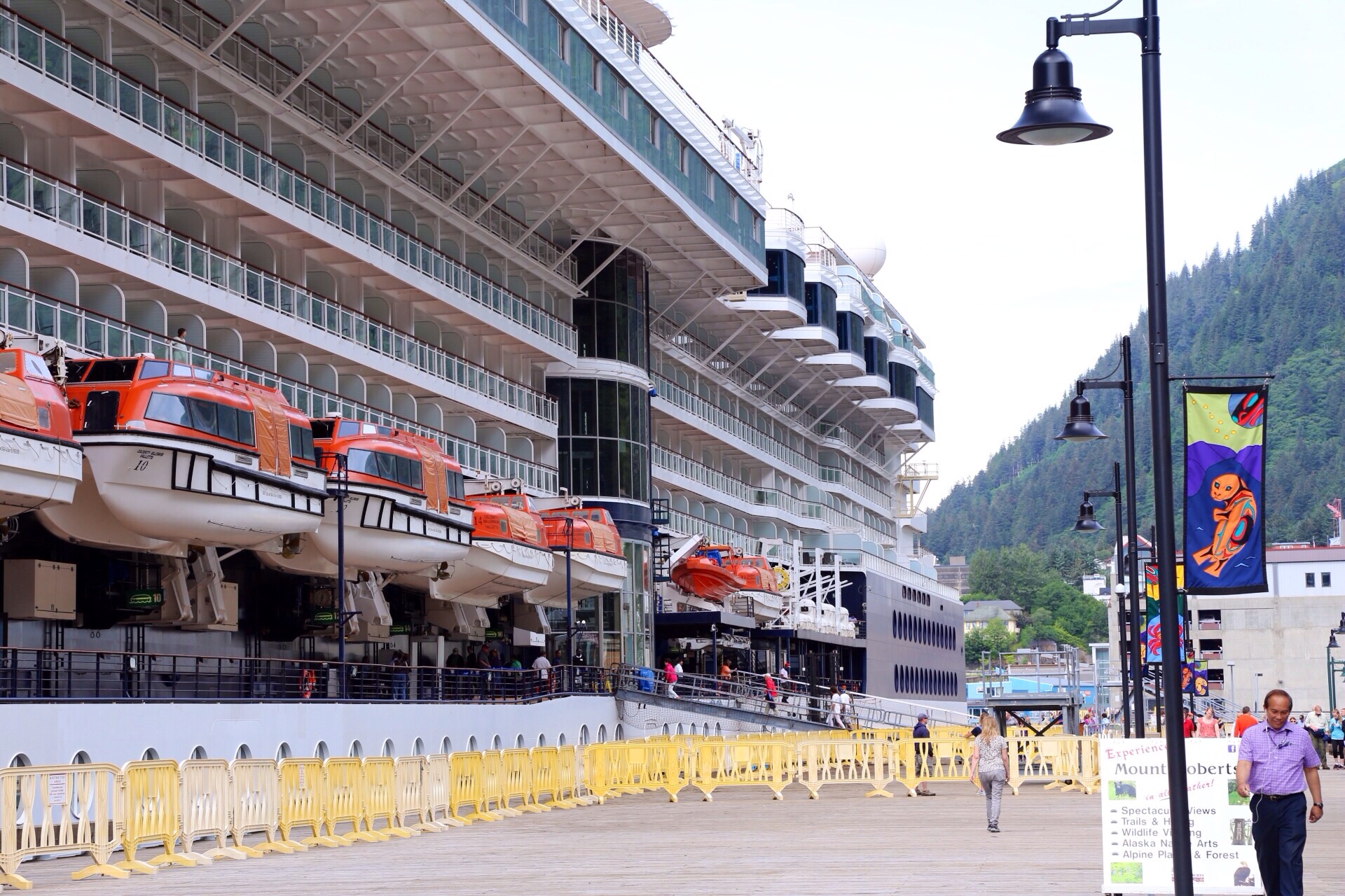 After some fruit, yogurt and a muffin from the local convenience store, we walk to the downtown area. Starting with a climb up a steep set of steps to Main Street, near the Governor’s house, then proceeding down to Front Street where the shops begin. I notice, but don’t go in, to some nice gift shops and galleries. The Foggy Mountain shop lures us in though, with its excellent collection of gear for the outdoors. We notice many things here you can’t get in Australia even though the brands are the same. After a couple of purchases, we continue down to the main touristy area. There are three boats in town, big cruise ships that hold between two and three thousand people each and all of them are currently wandering this part of town. The tramway to the top of Mt Roberts leaves from right near the cruise ship terminal, the cars moving steadily up and down against the evergreens that cover the mountain. We briefly consider going up but feel we have already seen Juneau from above – I’m told there is a good restaurant up there. There are booths in a line, all offering variations of the same tours – whale watching, glacier hiking etc. it’s all geared to maximize the opportunities offered by so many tourists in one spot, at one time, right down to the crossing guards especially placed to ease the flow across the street to the many jewelry stores selling tanzanite, gold quartz and nautical themed, silver trinkets. I spy the Twisted Fish restaurant at the end of the dock; it has a good reputation, so we head in for a lunch of lox salad and fish and curly fries. After lunch we circle back towards the hotel, pausing to look at the seaplane jetty, gold miners’ memorial and to grab a coffee at the Heritage Coffee Co. It seems the ‘it’ place to be with students crammed along the benches all hooked into the free wifi.