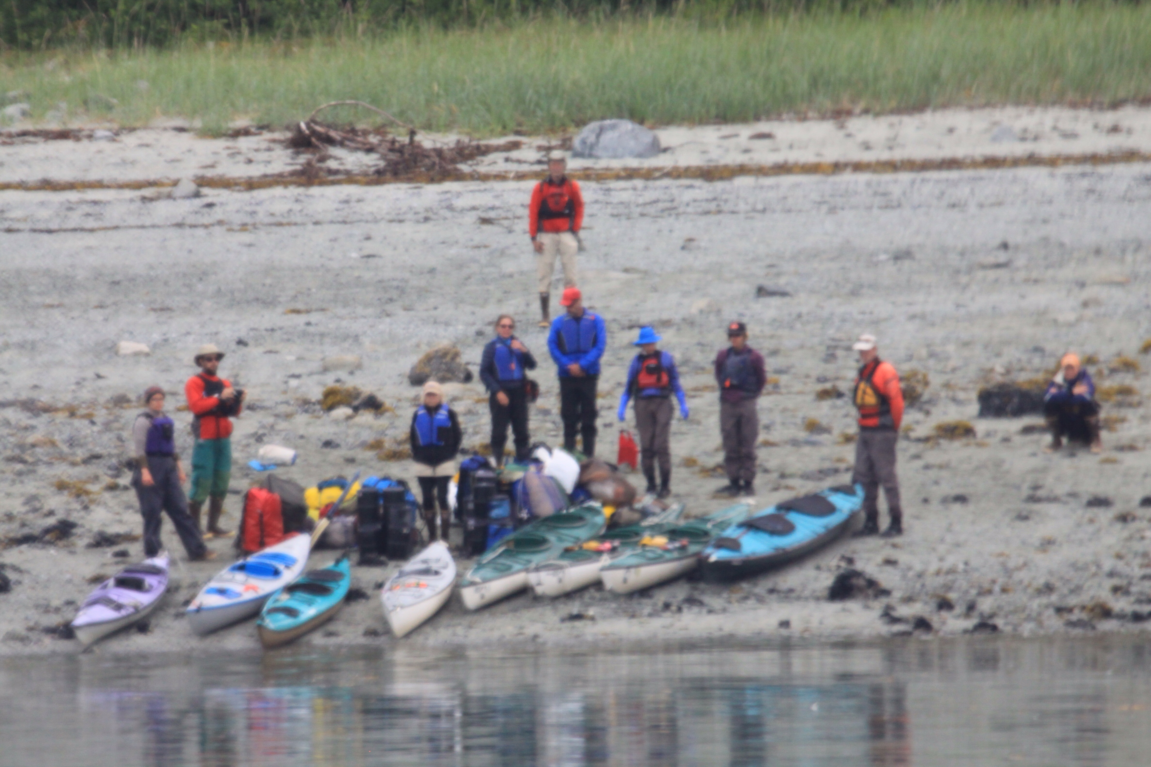 The other main thing to do (apart from a few hikes) in Glacier Bay is to kayak. Our boat drops off one couple going out for five days and picks up two groups, one of ten people and another couple. The captain runs the boat up on the gravelly beach, drops down a ladder and then the crew form a chain to load and unload supplies. They are well practiced and get a mountain of gear on or off very quickly – I counted 25 bear canisters with one group. Kayaking here is an adventure I’m told, it looks very open to me, even with the snow capped mountains that ring the bay. But, you can paddle into the narrower sections where the cruise boats don’t go and there are plenty of camping options. There also lots of bears, we see two brown bears on the beaches from the safety of our boat.