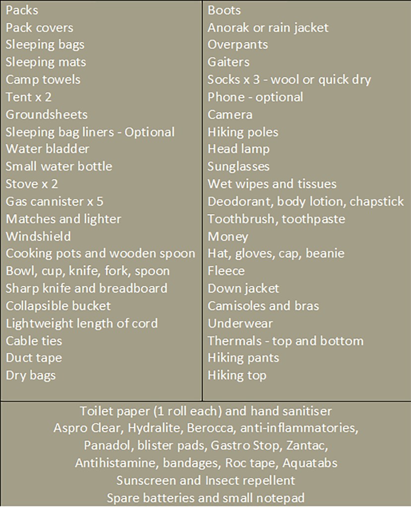 Links at the end are provided to gear and provisions lists. We weighed our packs at check-in for the flight to the start of the walk – Erin 27 (17kg), Nicole 49 (20kg), Lisa 54 (18kg) & Gordon 57 (19kg).