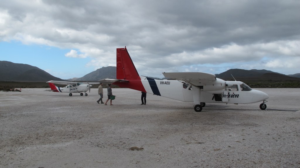 It was a tense ride, that flight. First, climbing up and over the thick smoke blanketing Hobart from all the bushfires – we weren’t sure until the last moment we would even be able to start this long-awaited trip. The pilot set course directly to Bathurst Harbour, flying into a headwind. Once over Preciptious Bluff, an impressive, craggy outcrop we can only glimpse, he turns south towards clearer sky, in preparation for descent. He warns us that things may get bumpy. I can feel the small plane struggling against the currents but the turbulence remains mild. The pilot doesn’t speak to us much but we can hear his conversation with another plane about 20 minutes behind us. He is guiding that pilot. All seven passengers are silent. Nicole and I squeeze hands. The plane is pointed between the hills either side of Cox’s Bight and then suddenly, it’s not. We climb and bank right, the pilot explaining he is getting some height and attempting another route. This time we glide easily over the beach at New Harbour, the hills are further apart here and the currents easier. Finally (and thankfully because I am busting for the loo) we circle the small landing field at Melaleuca. The pilot executes a gentle landing and we all clap. Relieved.