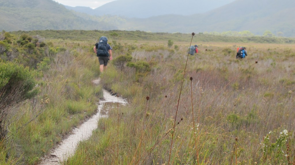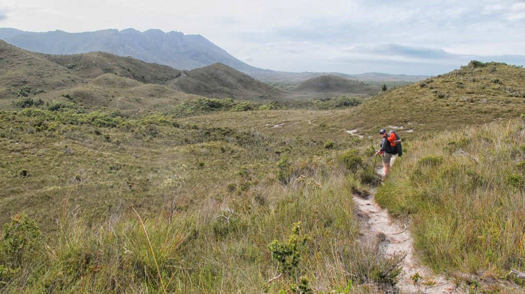 From here the track turns inland. Again, it is duck boarded in large sections. This makes the track both easy and hard. One glance at the terrain and you are glad to be walking above it (the newer sections are very high off the ground allowing regeneration and minimising wet feet from flooding) the swamp, mud and buttongrass would impede progress considerably. But the flat walking means the pack sits constantly in the same position, throwing off your centre of balance and hurting hip bones and shoulder blades. We have not yet eaten enough to reduce the 4.5kg share of food in these still foreign additions to our backs and the heat is increasing. By the time we reach the base of the Red Point Hills, we are all sweating and feeling a little light-headed. The sun is beating down relieved only by gusts of wind that cool us slightly. We decide not to eat lunch until we are over the 200m hills.