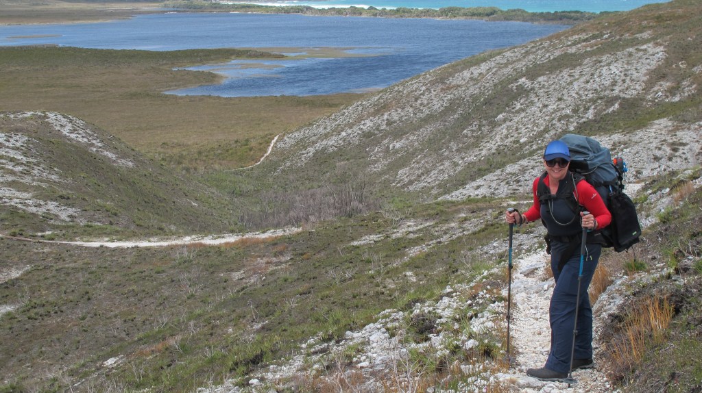 It’s warm and very windy. The boarding makes walking easy but without needing to concentrate on my feet, my mind wanders to my pack. At 18kg it’s the heaviest I’ve ever carried. I’m almost constantly adjusting the straps – tighter on the shoulders, looser, cinch the waist strap in, let it out. The chest strap impinges my breathing, now it’s not tight enough. We are not talking much. Erin and Nicole pull out ahead, almost racing to the coast. With views of Freney Lagoon in sight, they stop and we catch them for lunch. There is no shelter. We eat our Subway rolls eagerly, conscious that they may be the last interesting food for a while.
