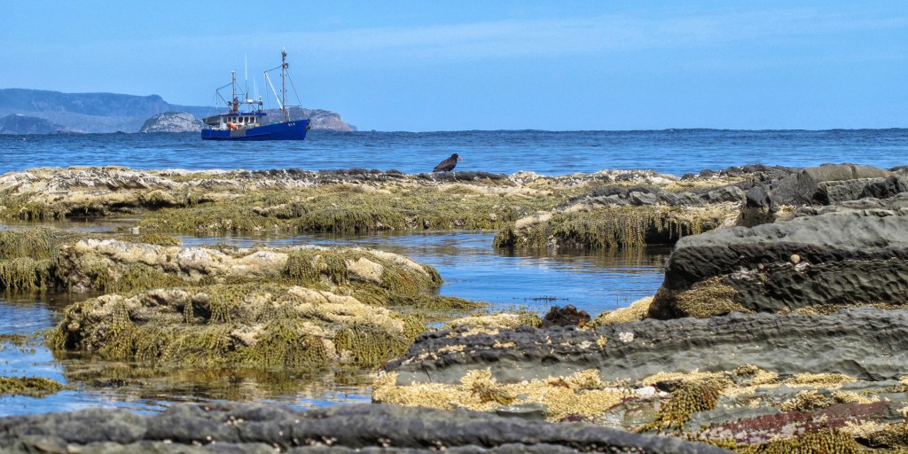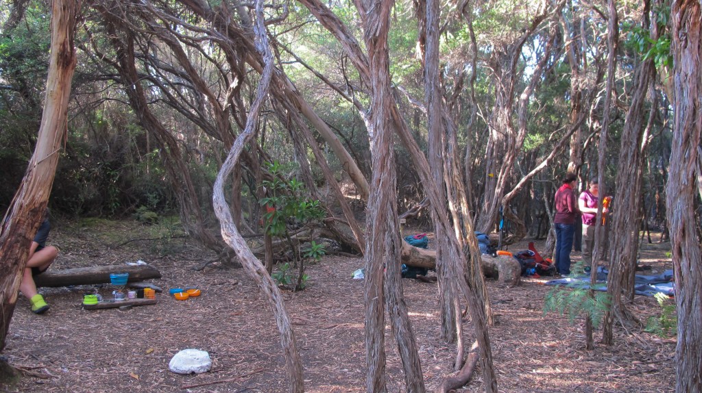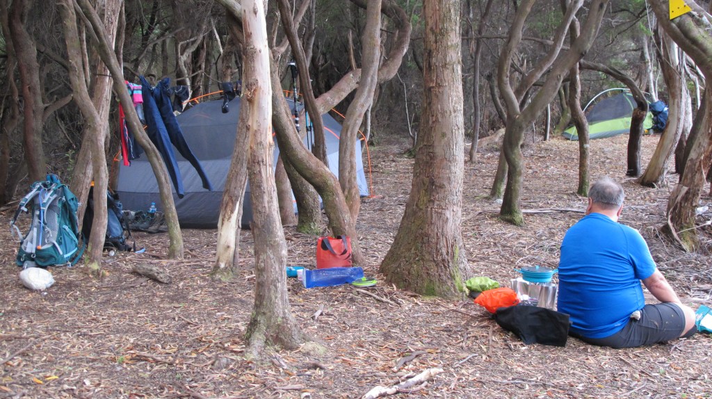 What a terrific camp! Camp furniture made out of duckboarding, rocks and logs. Loads of big, open sites with views out over the bay and lots of shelter beneath soaring gums. The afternoon and evening spent here will be among our favourites. Splashing in the creek, washing ourselves, clothing and equipment. Napping in the tent. Short walks for photos. A crayfish boat appears, dropping its pots along the shoreline. It adds to the vista.