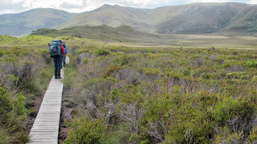We reach a long, flat section on old duckboards that are partly submerged and muddy. From here the views west to Federation Peak are superb. The sun even comes out for a while but it’s still cold and windy with nowhere good to stop. Just when we think we are at the top, another steep part appears but finally, about 1pm, we are up top. The ascent we had dreaded was, apart from the weather, really not that bad. We had taken it slowly, stopping frequently and so, at this point, had plenty of energy in reserve.