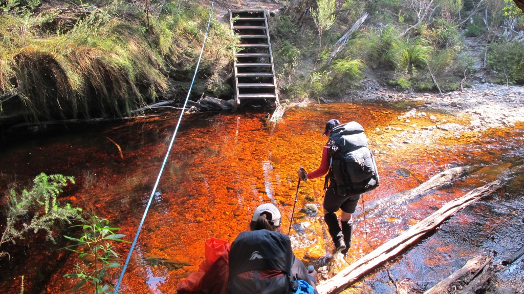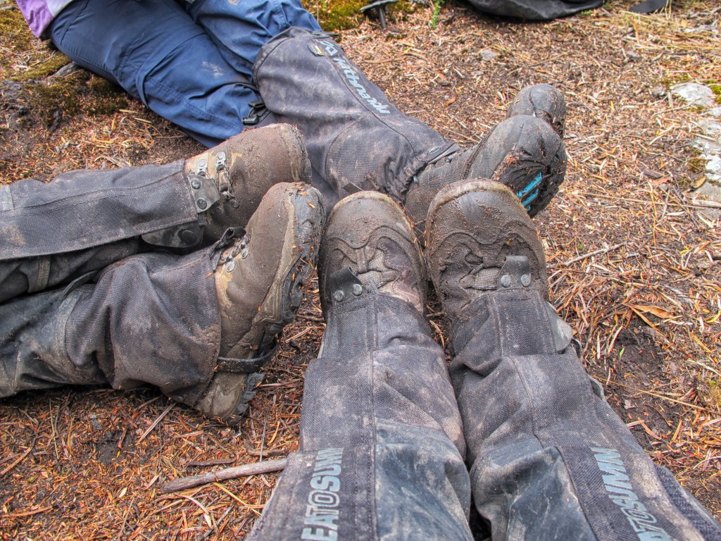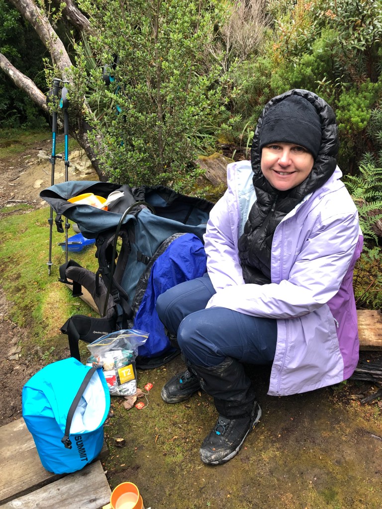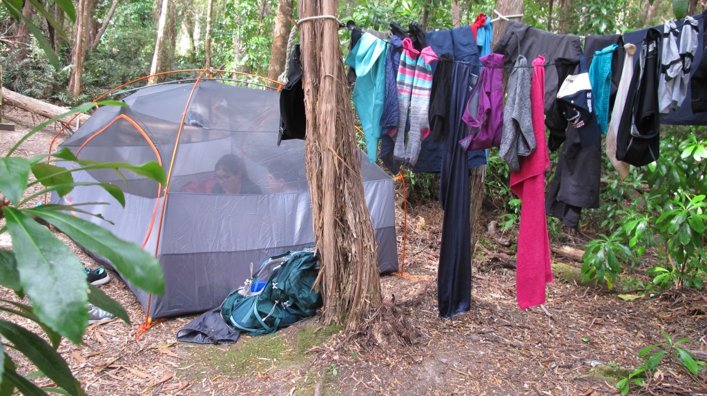 It’s no surprise that we sleep late today. We are exhausted. So many aches and no chance to dry out our walking clothes means we put on wet, sweaty socks and muddy gaiters. The mood is high however, we are proud of ourselves for getting over and down the Ironbounds in one piece. Today was scheduled as a rest day but we are still 3 and a half kilometres from camp.