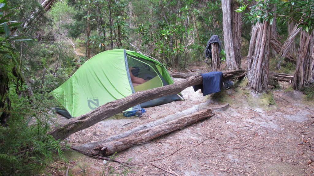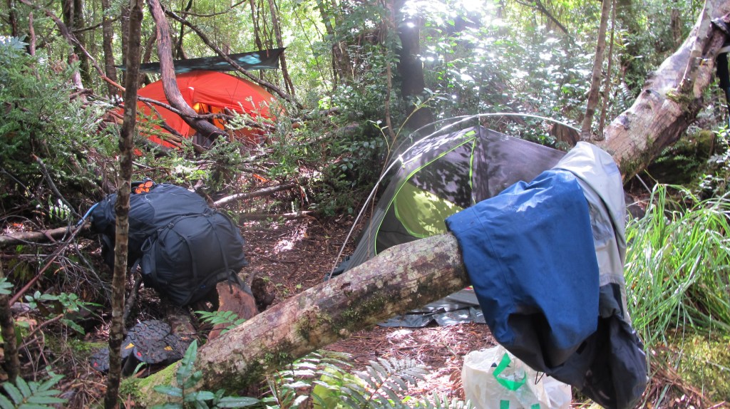 Ironbounds low camp is just a couple of clearings in the rainforest. There is room for a few, small and medium sized tents. Fresh water is from the creek a further couple of hundred metres down. Getting to it is more of the same, roots, mud and tricky footings. Gordon takes on this responsibility, bringing back our ten litre bucket full so we don’t need another trip. It is enough for our soup, freeze-dried dinners and oats and tea in the morning. There are a couple of heavy showers during the night but overall, it’s a good spot to stop if you run out of daylight as we did.