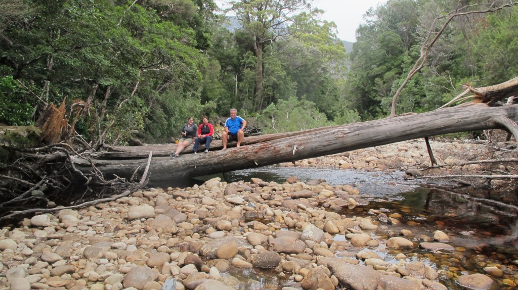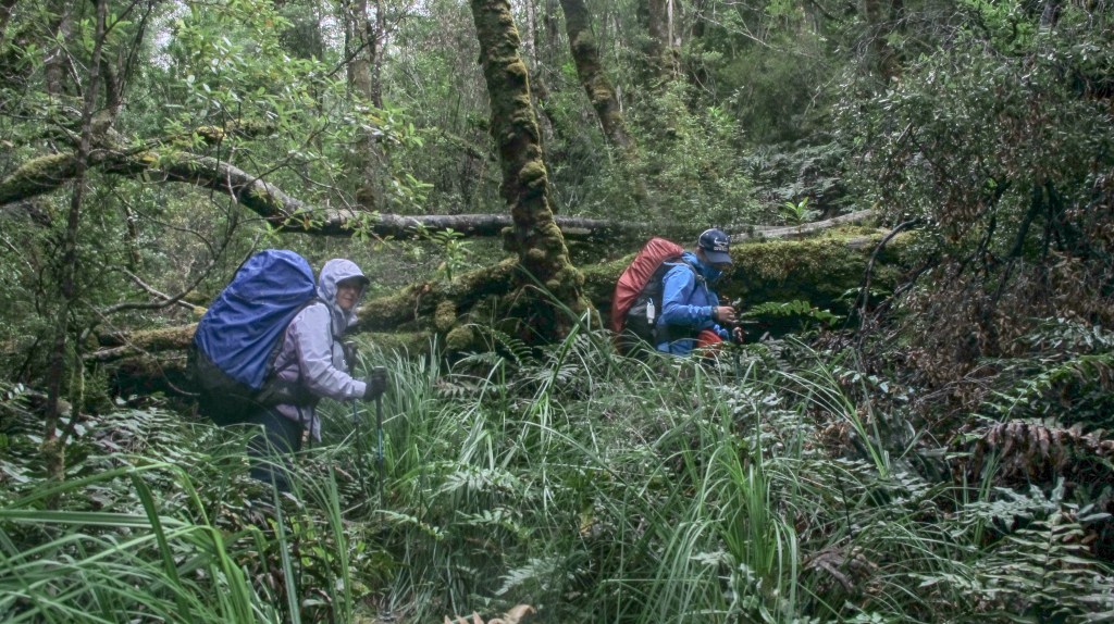 Packs are hoisted, straps tightened and we are off again, downhill 300 metres to the creek. It’s more of the same, muddy logs, slippery rocks and fallen trees – it takes 20 minutes! Erin is taking photos as we cross the small, flowing creek. We are chatting and happy and don’t notice the track being signposted downstream and to the right. Others have clearly made this mistake as the track to the left is well-trodden and seems obvious. It’s easy enough at first, well not exactly easy, but similar to the terrain we have been crossing. Then, it gets harder, more fallen trees to climb over, more overgrown and uphill constantly (we should be descending). After 20 minutes Gordon, who is at the back, calls a halt. This doesn’t feel right he says, let’s check the book. Sure enough, the one place you can take a wrong turn and we’ve taken it! So back down we go, easily wasting 50 minutes. This really deflates our mood. Back at the creek we see that the correct path is quite obvious. We just hadn’t been paying attention. It’s a good thing we hadn’t tried this in the dark and that we don’t have far to go today. We need some rest.