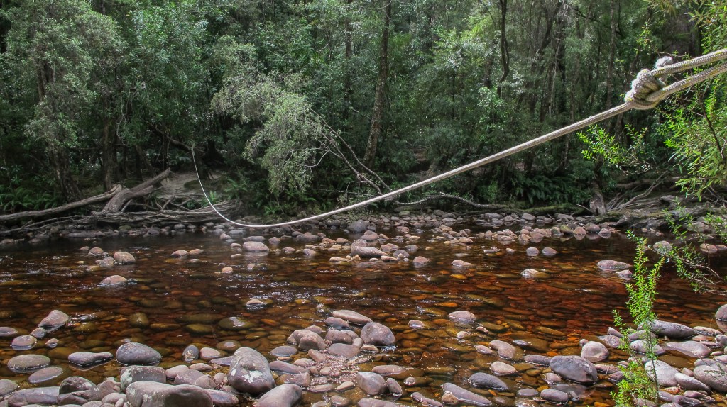Finally, we burst out of the forest right onto the banks of South Cape Rivulet. It’s not too high, knee deep. I can see why you would have trouble crossing in high water but we wade over easily. A left turn and the campsite is next to the creek. We try to get our water from further upstream, worried about brackish water, but it seems fine. This is another lovely campsite. The sites are well spread out, flat and there are plenty of logs to sit on. We also soon have a visitor, a cute pademelon that knows campers come with food. We try to make the most of our last night. We’ve saved the roast lamb and vegetable freeze dry, a mutual agreement that the meals with separate potato are the best, until last. I fall asleep to the sound of the ocean and reflect back over the past week.