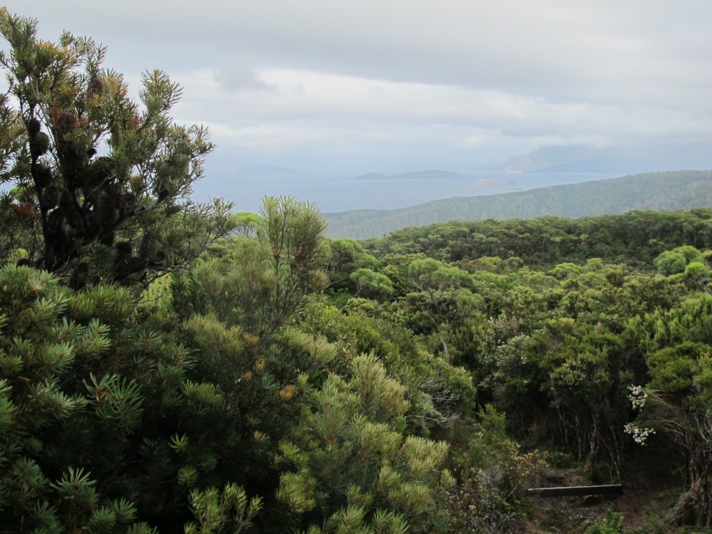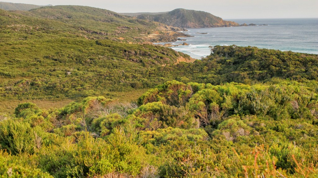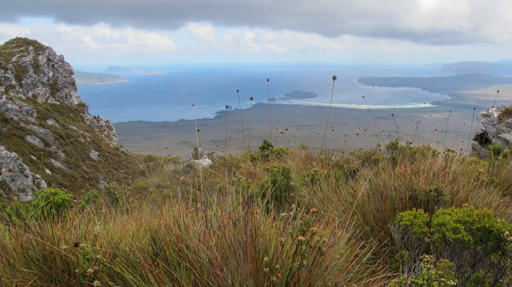 Today is another big climb day. Up to 700m over the South Cape Range. Leaving camp early, we climb almost immediately, surrounded by forest. It’s steep, but we use the slow and steady up method with short stops to catch our breath. In good time, we reach Flat Rock Plain, just below the summit. The views are spectacular here, back over the past few days of walking.