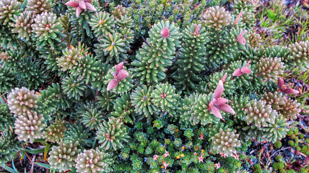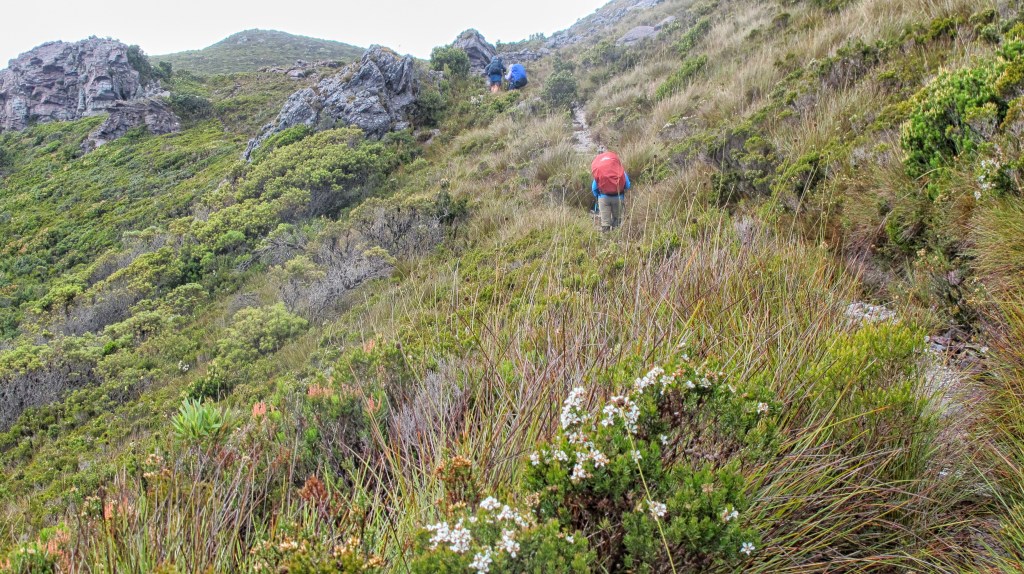 The day starts drizzly and cool. We are up at first light, hoping to get a good start on the 12km we plan to cover. Packing wet tents is never fun but it’s all done quickly and we put on rain gear and covers over our packs. Mossy forest soon gives way to the uphill track. It’s exposed and windy but allows great views. We climb quickly. There are steep sections and flatter parts that allow us to take a break. There are also enough places to get out of the lee of the wind and drizzle. I take a lot of photos that also give me a rest from the uphill.