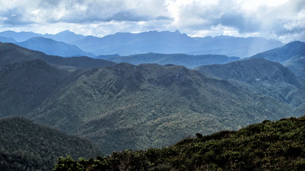 A slow-moving morning. My legs are leaden. I can only guess it’s from the heat of yesterday but I tell my body, yup, we are putting that pack on again. Surely the weight has reduced a bit now? It is feeling lighter; there is certainly more space inside. The back-track to the main track is fast even though it is through the muddy, swampy, twenty potential routes section. We initially climb gently through the buttongrass still enjoying the views to our left and right. The track then climbs into open forest. It’s warm again but the walking is relatively easy, a few muddy sections but nothing hard. I start to struggle as the climb steepens. There is no reason, just one of those “heavy leg” days. I walk slowly, one foot in front of the other, deep in my own head. I fall quite a way behind and Gordon stops to wait. I appreciate this but feel bad all at the same time. Our breaks become more frequent at Gordon’s insistence. This is good but is also blowing out our walking time.