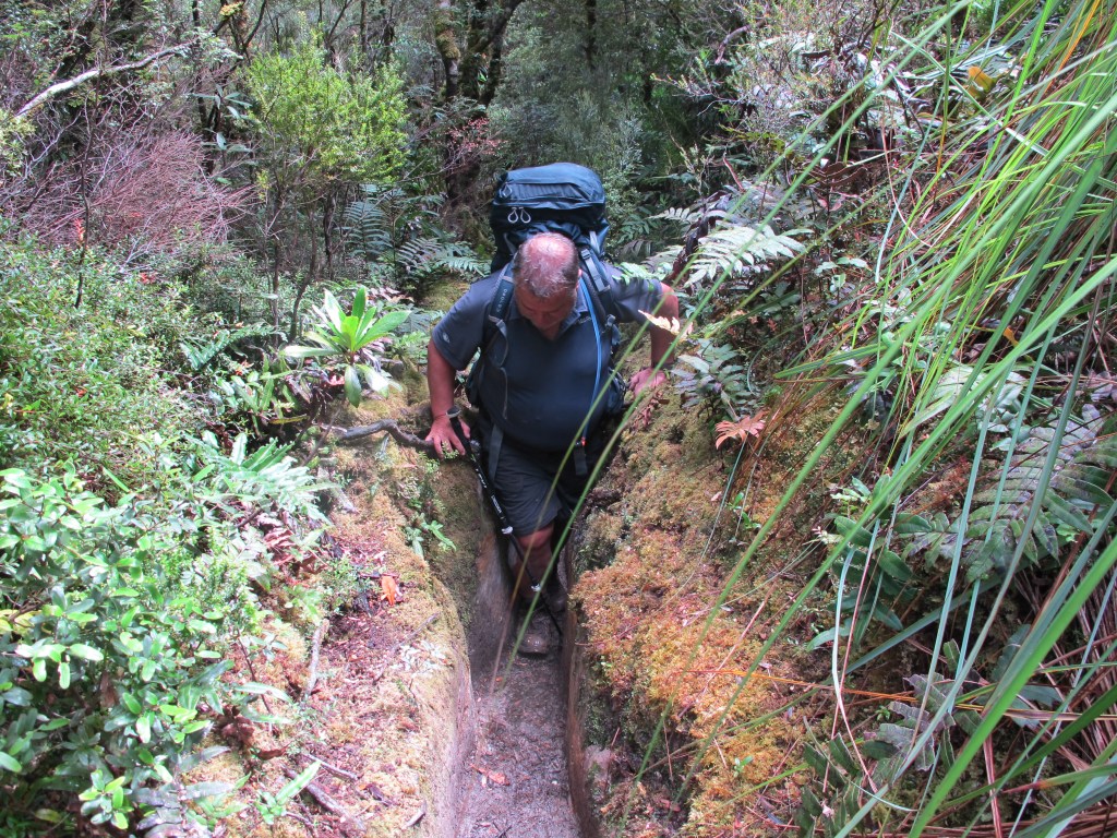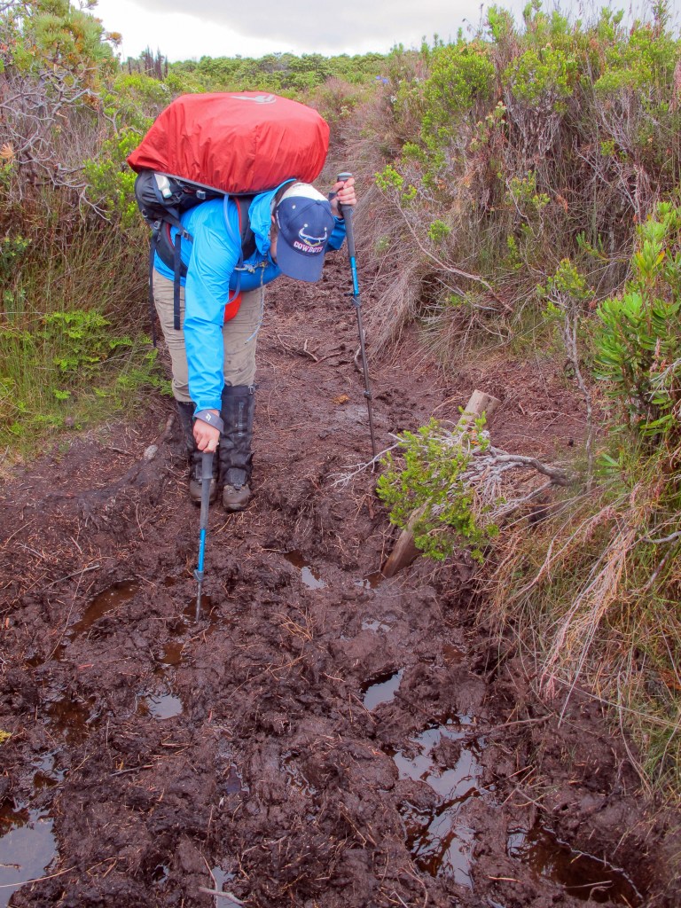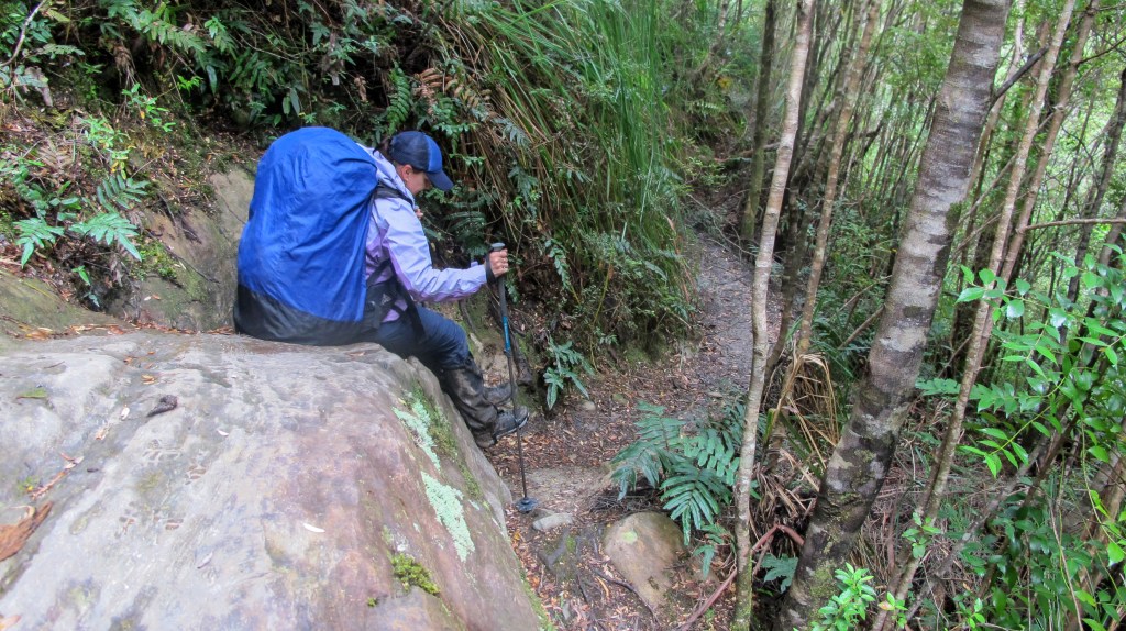 At first, it’s more duckboards but soon we are quickly enveloped by the rainforest. I cannot imagine coming up this way. Each step requires lowering myself almost half a metre, often into mud or onto a mossy branch with footing needing to be carefully considered so an ankle isn’t twisted. If I was coming up, it’d be hands and knees, all the time. It’s not the first time on the walk I’m glad we are travelling in this direction. I knew it would be hard, I’d read about it in many blogs and on forums, but the reality is still a challenge – crawling on hands and knees under wet branches, wading through mud, straddling trees to get over them getting covered in mud, avoiding slippery, muddy roots and balancing on slimy logs down a path that is largely a small, badly eroded creek and did I mention, navigating through mud. I fall three times collecting bruises and making sure my gaiters never look the same. My knees aren’t great, so the pole is deployed, constantly.