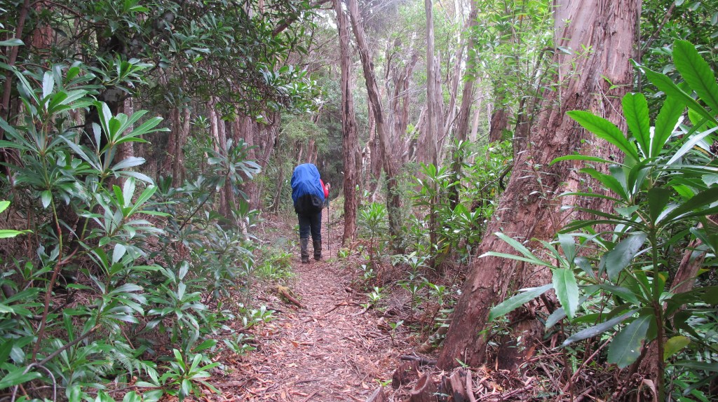 After just a little more steep walking, we pass the highest point although there is no view. Then we descend. It’s easy at first, but soon changes to the same eroded, muddy, tree dodging in the rainforest situation we have encountered before. We stop at the small creek below Trackcutter’s camp and top up our water. The track ascends again from here, it’s literally cut through the hillside in one place and we only just squeeze through with our packs. Lunch is at Trackcutter’s. It’s cold and windy but would be an okay place to camp (just remember to collect your water from the creek).