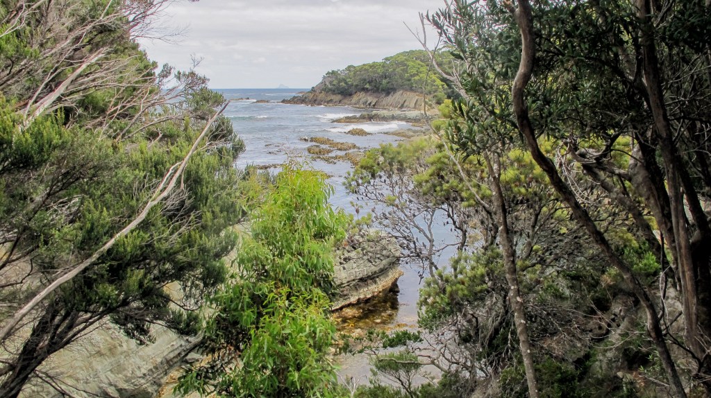 We take our time packing up camp, then head down to cross the creek, pick our way over the small, round stones and head into the bush. After a short, easy walk and we emerge onto Deadman’s Bay. This beautiful sweep of a beach comes complete with driftwood sculpture. Soon, we again exit the beach into the lightly wooded forest behind Menzies Bluff. It’s a constant ascent but easy and we travel quickly, stopping frequently at many of the coastal viewpoints, taking photos and enjoying the walking. The day is warm, however and I start to suffer as we descend to Grotto Creek. My feet are burning up in the hot, woollen socks and gaiters are adding to the misery. Gordon waits patiently, as I strip off unnecessary layers, dodging a friendly leech that has hitched a ride on my boots. It sits on the rocks sniffing in our direction. I almost feel sorry for it.