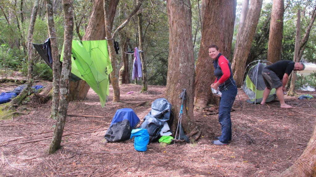 Erin and Nicole are mostly up ahead. I’m so impressed with their attitude; this is a hard day, but no one complains. Gordon stays with me. I know he can go faster and that he is used to this kind of walking, most of what he’s done in the south-west is like this and harder. I suck it up and just keep stepping down. One move at a time and eventually we reach a clearing where Nicole and Erin are waiting for us. They are literally sitting in a hail storm. The tiny pellets are sheeting down, covering the mud like a beanbag has burst open. From here it’s only 900m to low camp; a very long 900m. We know we are not getting to Little Deadman’s tonight. It’s already 7:30pm and we’d left camp at Louisa River at 7:30am. Twelve hours is enough. We are done for today anyway.