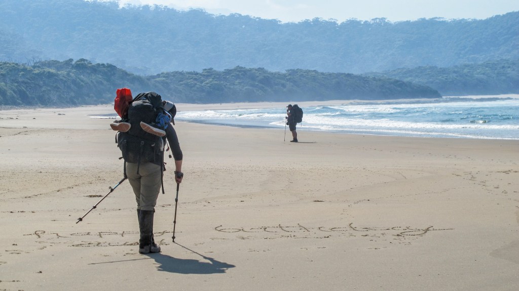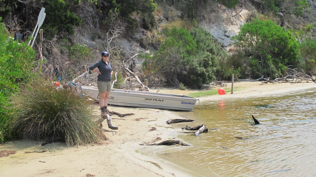 To cool down, I decide to walk the 4km of Prion Beach in camp shoes. Bliss. Nicole and Erin have taken off ahead, leaving messages in the sand to encourage us along. The march flies decide Gordon is their master and surround him in an attentive halo for the entire length of the beach. The walking is easy, but again it gives nothing else to focus on except the heaviness of the pack and the heat of the day. The 99 bottle of beer song once again becomes my mantra. We make it to the end of the high dunes and cross to the lagoon and the waiting punt. The beach does continue, all the way along to just below the headland of East Prion campsite. But the water crossing there is reported as risky due to deep water, currents and quicksand…yep, quicksand. We decide to stick with the official track and cross the lagoon by boat.