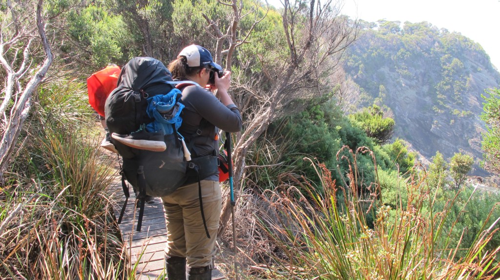 Resuming the walk, we come across some of the deepest, widest, most unavoidable mud of the hike. It’s less of an effort to just walk through it, though in many places, logs, rocks or pieces have timber have been placed strategically so you don’t sink too far. I still manage to get stuck however, so deep in mud that the suction stops me from freeing myself and Nic has to grab my arm. I’m actually pleased that I’ve been properly initiated into the south-west mud club! Despite my two mishaps, we are moving quickly and hopeful today won’t be as epic as the Ironbound’s day.