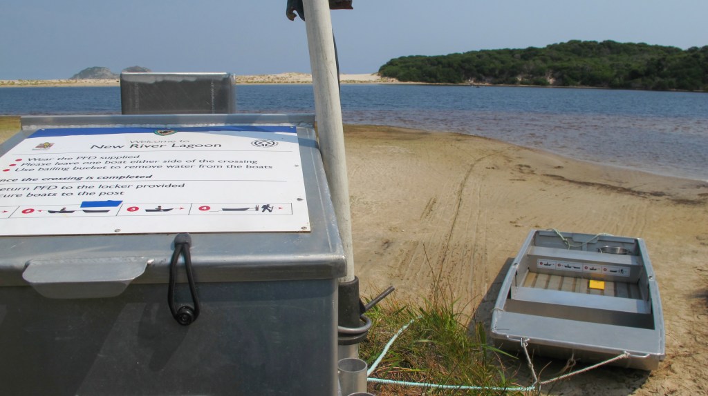 There are three boats altogether and it just depends on your luck whether there are two on your side of New River Lagoon. If not, as it turns out for us, you have to row across, unload, drag one of the other boats down, tow it across to the other side, drag it up and secure it to the post and then row yourself back. The good news is that the new punts are quite large and the four of us fit easily into one, along with our backpacks. So only one poor sap gets to do the boat shuttle. We use the shelter of New Prion campsite to prepare lunch while Gordon completes his task. We consider camping here – we’ve already walked 9km today and it is 3pm, but we reason that it’s only 4km to Osmiridian Beach and we’ve heard that it’s a much nicer campsite and there are loads of march flies and mosquitoes here plus, it would be good to make a little more progress.