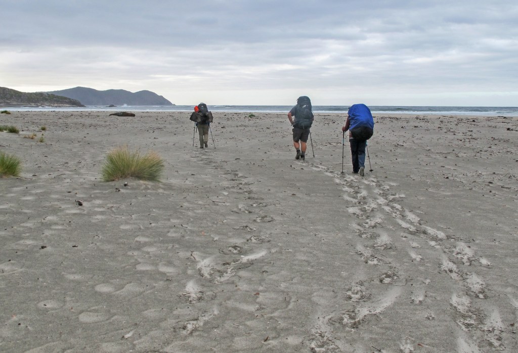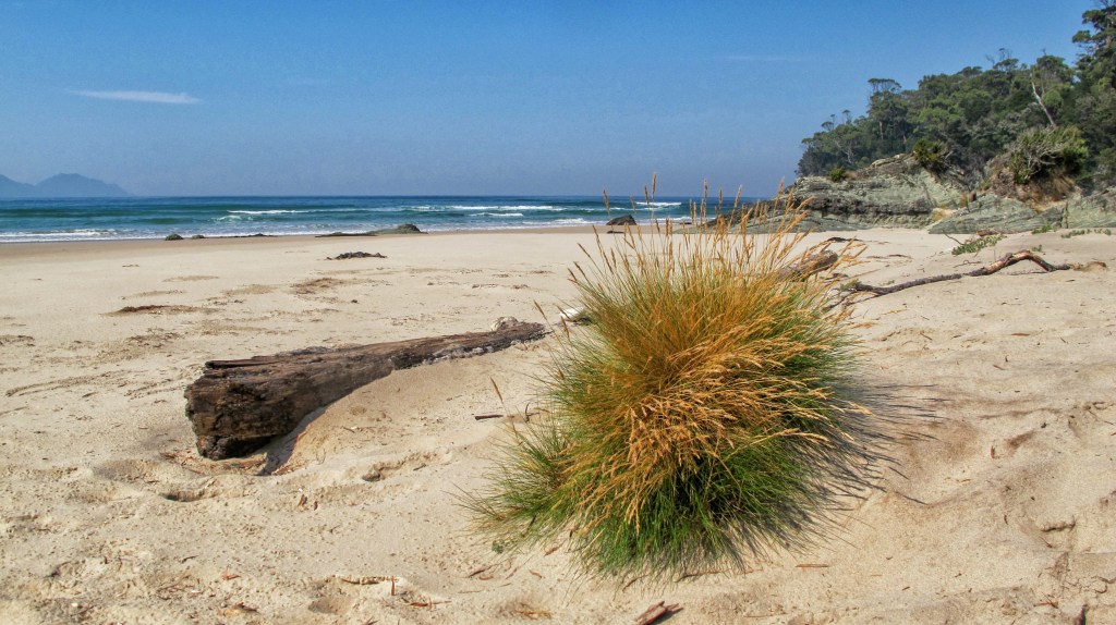 The track climbs a little, skirting the side of New Harbour Range. The views stretch out over Cox’s Bight, Point Eric, the Southern Ocean and beyond. After a short section through very long grass and coastal scrub you spill out, almost unexpectedly, onto the beach. The other group of four, from the second plane, are already here. Boots off and mucking about in the ocean. They pass us quickly, padding barefoot along the long stretch of beach – we don’t see them again after today. Soon we pass through the light forest of Point Eric, sign another log book and choose a campsite.