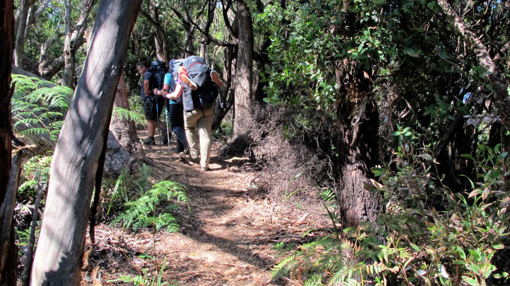 For another 600 metres or so the descent continues over heavily eroded and overgrown rainforest, moss and mud, lots of mud. Where we can we just walk through it, it’s easier than trying to pick around it and risk slipping anyway. Finally, after skirting the hillside, the track opens out into light, coastal forest. Beautiful old gum trees reach high and soft leaves are underfoot. The ground is drier too and, as our first coastal views come into sight, the walking becomes decidedly pleasant. The last two kilometres into camp are gorgeous. Our legs are grateful for the chance to stretch out in stride. No more knee-grinding step downs. We pass bay after pretty bay until, just on lunchtime we arrive at Little Deadman’s.