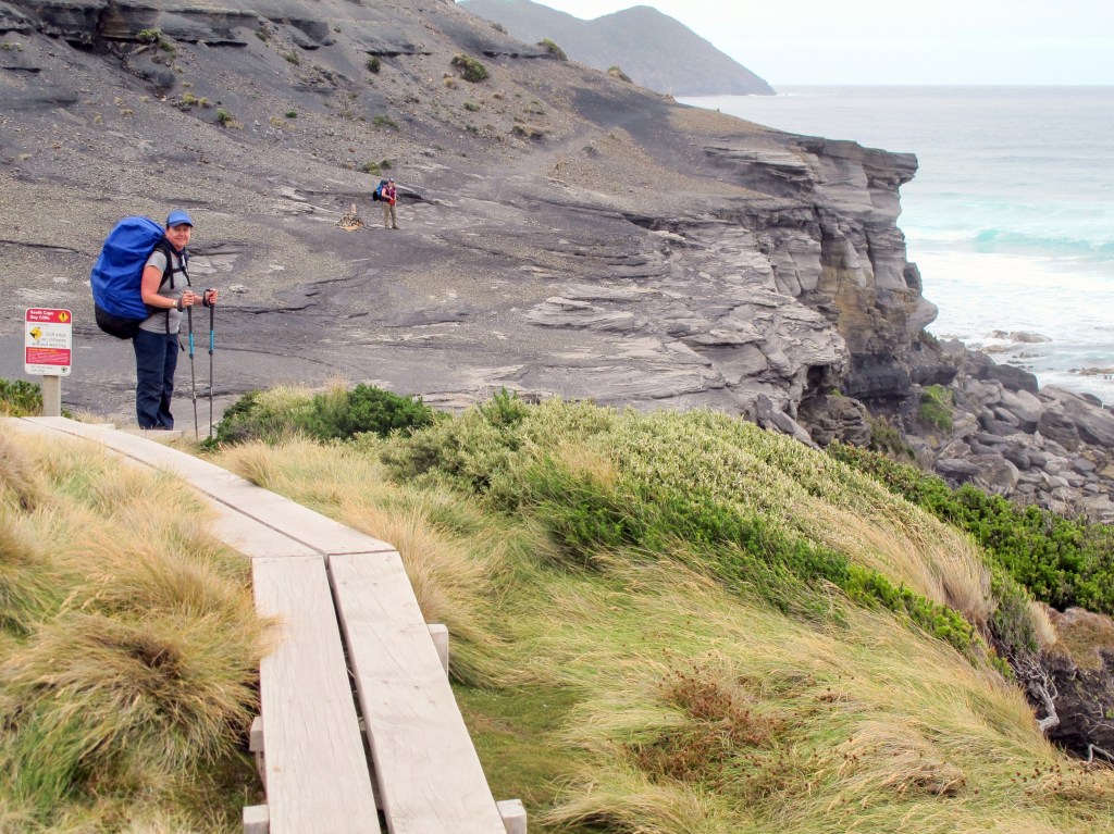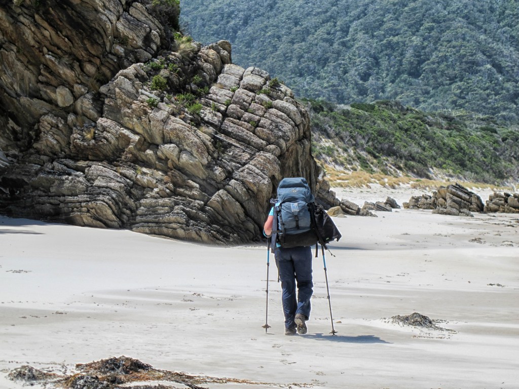 It’s a relief to head downhill to Surprise Bay, a beautiful beach with rocky outcrop formations. We stop for a scroggin break, refill water bottles and enjoy walking beside the crashing waves. The climb off the beach is steep – there is a rope with knots at strategic points, to help you up the rockface. We clamber up to the campsite and find an almost sheltered spot out of the wind to have lunch. We are on the second salami day after roast beef and pastrami on the first few days, the salami isn’t as nice but with cracker barrel cheese and the last of the sun-dried tomatoes with our wraps, the food is pretty tasty. We have a long break here and there is a short debate about stopping. I can tell Gordon is concerned how tired I am, but a camp here means pushing the whole trip out another day. We have some emergency food, however it would mean missing our scheduled pickup. It’s only 3.1km to Granite Beach; I think I can do it without injuring myself from a stumble or something silly that can happen when you get tired.
