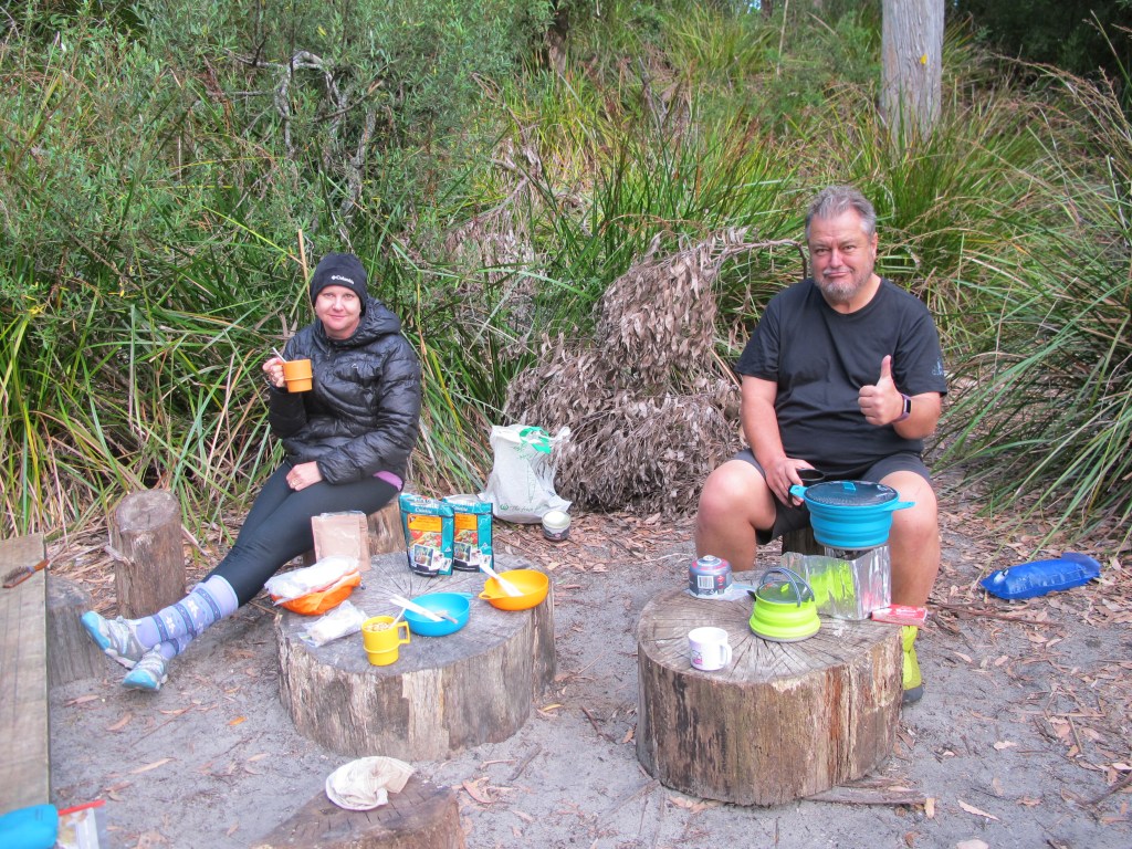 In the gloaming, a lone hiker appears – Milo – we had met him at the airfield. He had walked the track already and had intended to go on to Port Davey but as that track was closed and he couldn’t afford to fly out, he had turned and come back. He is aiming for Louisa River, 7kms further on, by nightfall, so only stops to chat for a short time. He is the last person we see until Day 9.